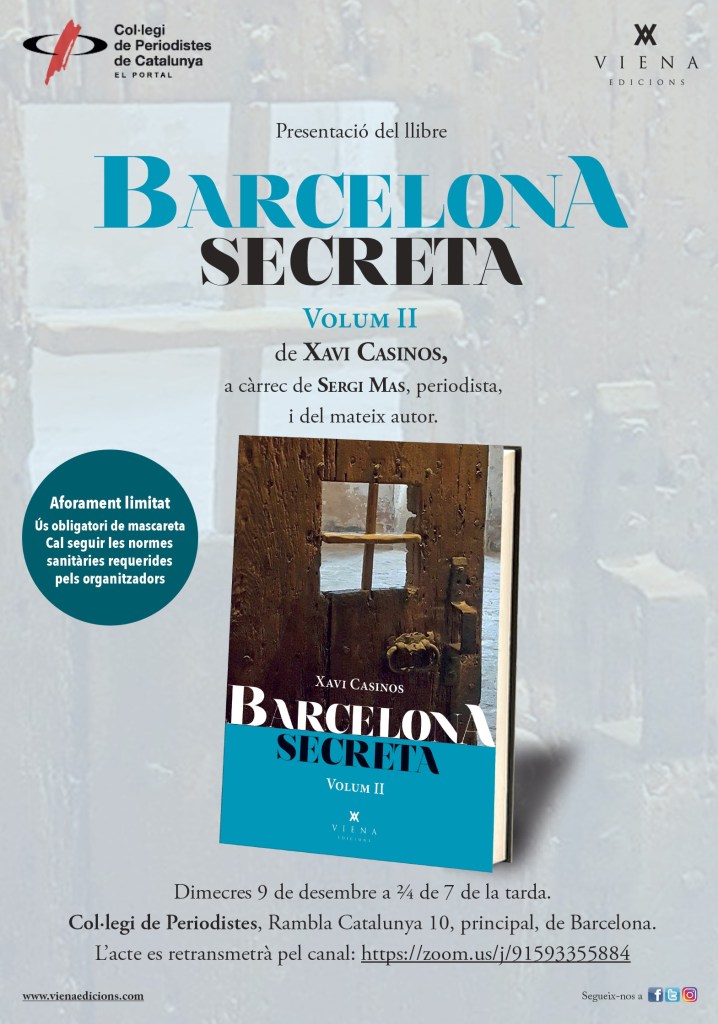 Benvolguts, nomès recordr que el proper dimecres 9 de desembre tindrà lloc la presentació del meu darrer llibre, ‘Barcelona secreta 2’, al Col·legi de Periodistes (rambla Catalunya, 10. 18.30). Degut a les restriccions a cauda de la COVID-19, l’aforament es veurà reduit a un terç, de manera que només podran accedir al local unes 30 persones. Per poder fer-ho, s’ha de reservar al correu viena@vienaedicions.com. Qui vulgui, podrà seguir-ho vía telemàtica per Zoom a través de l’enllaç https://zoom.us/j/91593355884. En aquests moments estem treballant en l’organització de properes presentacions. És una llàstima no poder gaudir de molts de vosaltres el dia 9, pero són les conseqüències d’aquesta situació tan difícil que estem vivint.