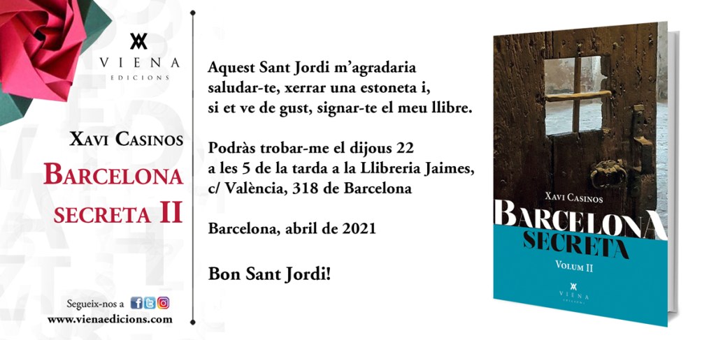 Em plau anunciar-vos que el proper dijous 22 d’abril, a les 17.00 hores, signaré exemplars del meu darrer llibre ‘Barcelona secreta 2’ a la llibreria Jaimes (Valencia, 318). Tots sereu benvinguts. Divendres, el dia 23, també signaré a la llibreria Freetime i al lloc de venda de la llibreria +Bernat amb La Vanguardia.
