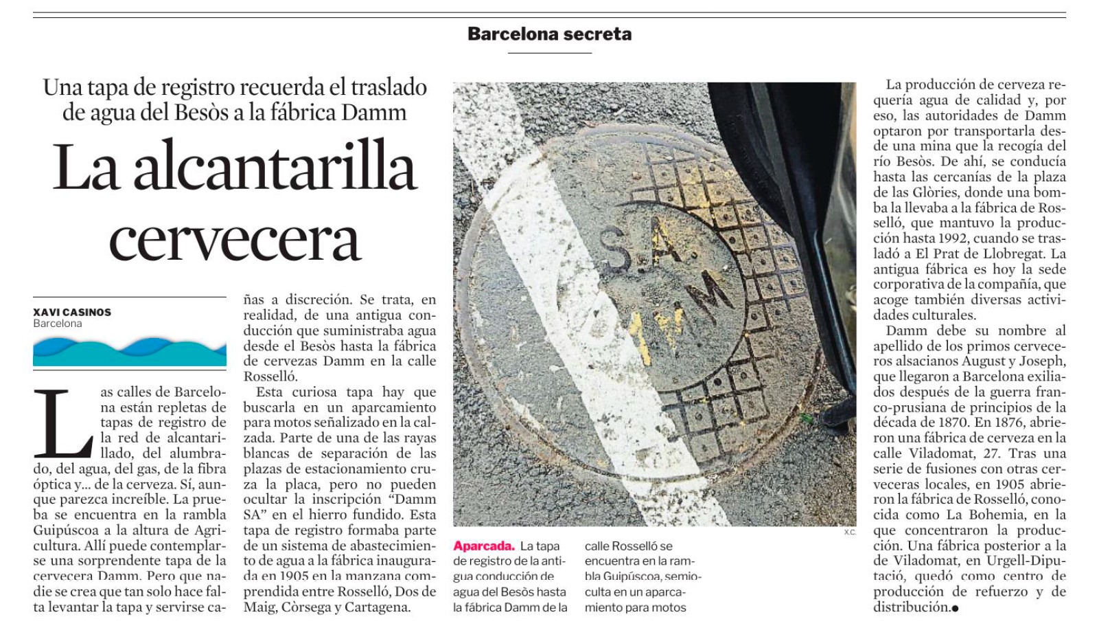 La tapa callejera de la Damm La edición impresa de La Vanguardia publicó ayer, en la sección Barcelona Secreta, la insólita tapa de alcantarilla que cervezas Damm Tiene en la rambla Guipúscoa. Compártelo: Haz clic para compartir en X (Se abre en una ventana nueva) X Haz clic para compartir en Facebook (Se abre en una ventana nueva) Facebook Haz clic para compartir en LinkedIn (Se abre en una ventana nueva) LinkedIn Me gusta Cargando... Relacionado