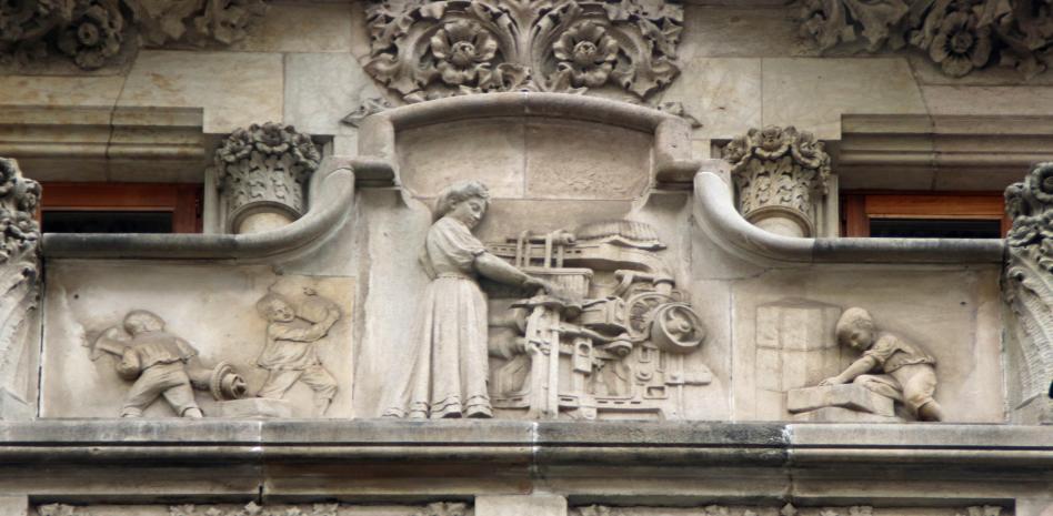 Tres niños haciendo trabajos duros forman parte de una alegoría sobre la industria textil en un edificio de principios del siglo XX del Eixample. Hoy sería políticamente muy inapropiado. Esta es la historia de hoy de mi serie Barcelona Secreta en Lavanguardia.com. Podéis leerlo en el siguiente enlace: