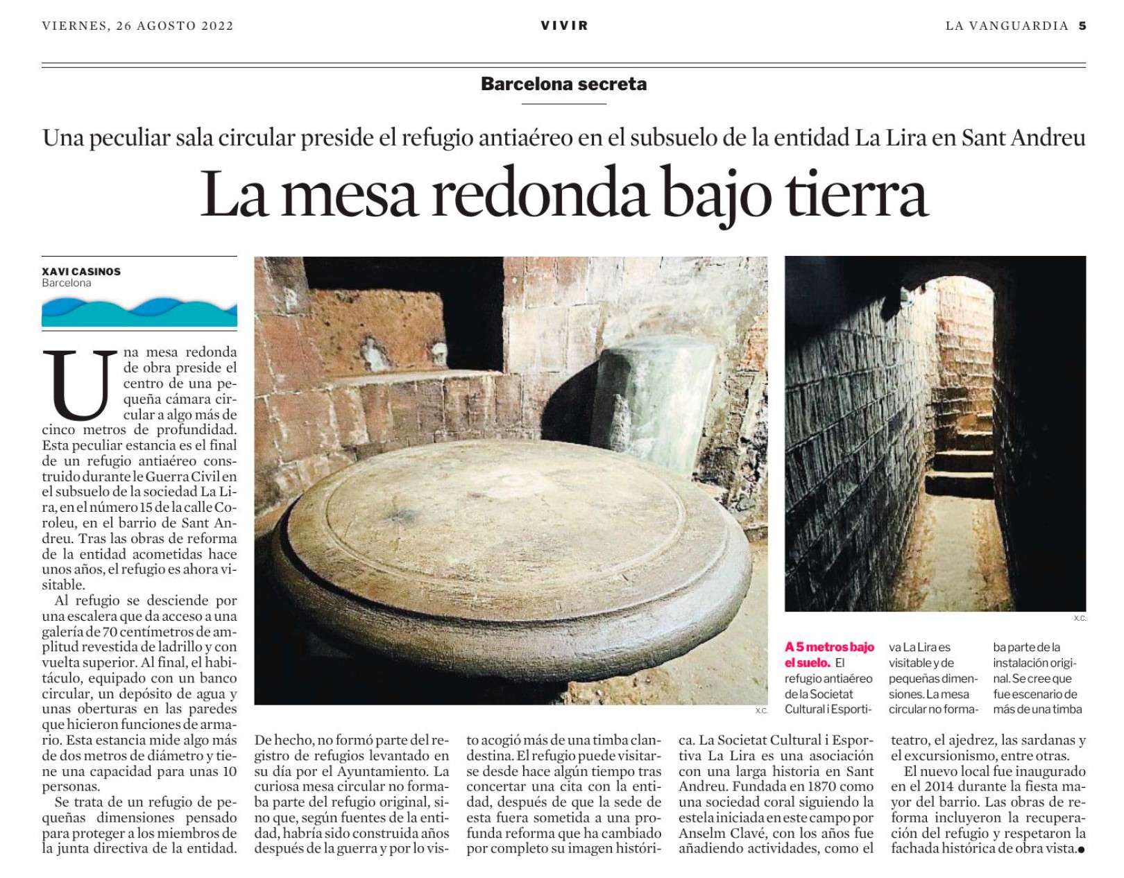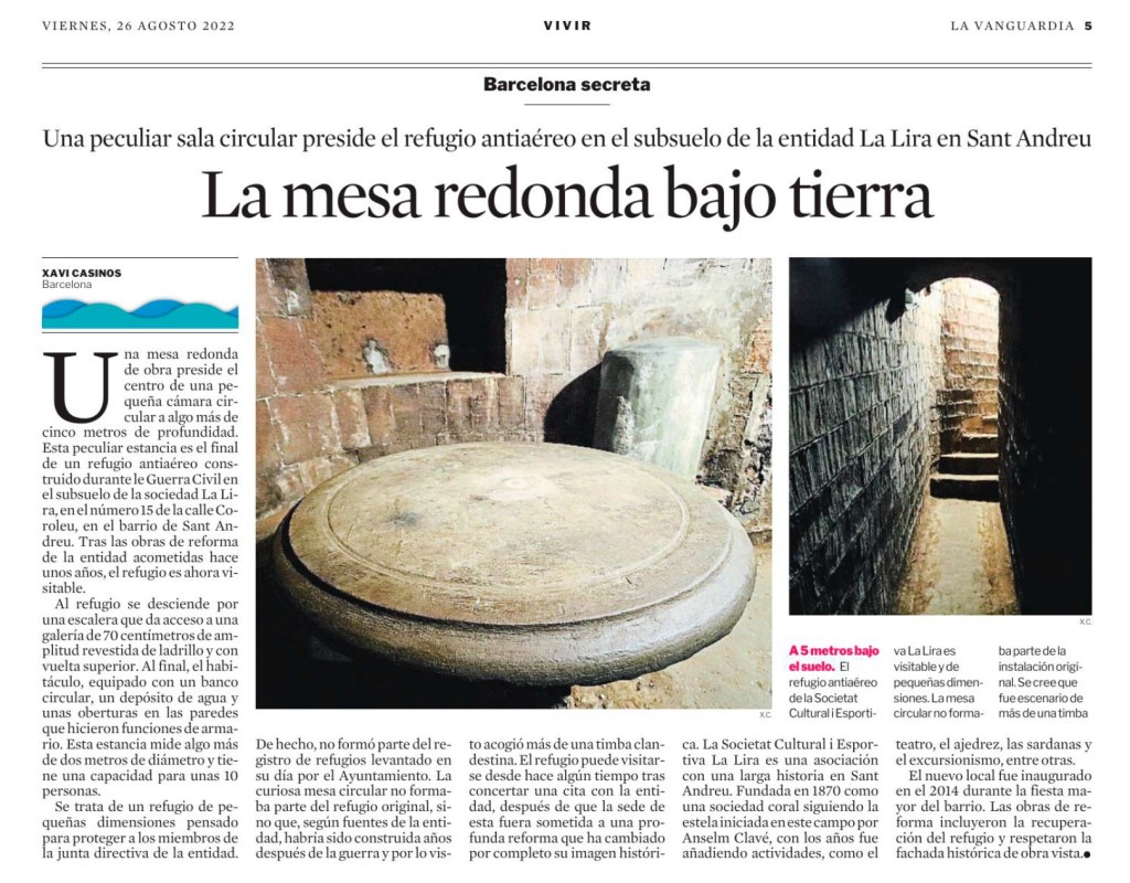 El misterio de la mesa redonda La edición impresa de La Vanguardia publicó ayer, en mi sección Barcelona Secreta, la historia de la mesa redonda que hay en un antiguo refugio antiaérea bajo la sociedad cultural la Lira, en Sant Andreu. Compártelo: Haz clic para compartir en X (Se abre en una ventana nueva) X Haz clic para compartir en Facebook (Se abre en una ventana nueva) Facebook Haz clic para compartir en LinkedIn (Se abre en una ventana nueva) LinkedIn Me gusta Cargando... Relacionado