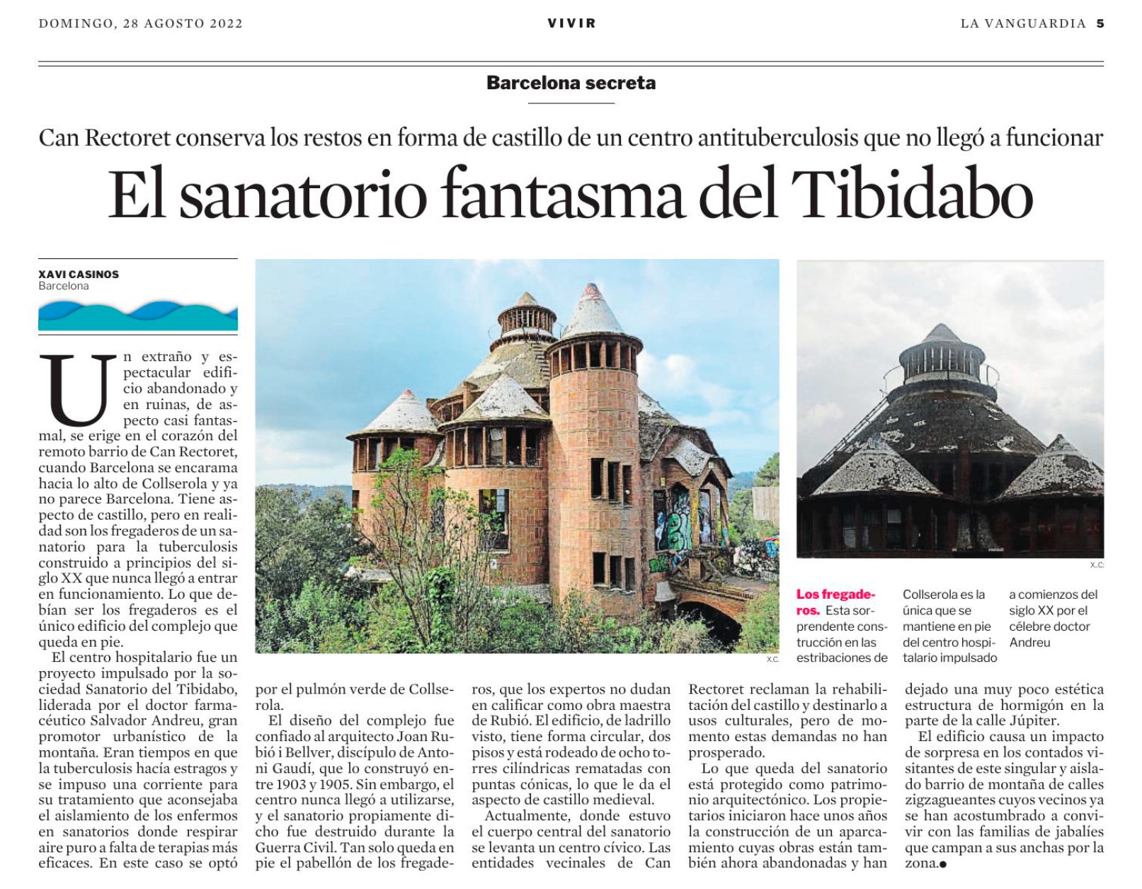 El sanatorio de Can Rectoret La edición impresa de La Vanguardia publicó ayer, en mi sección Barcelona Secreta, la historia del misterioso sanatorio en forma de castillo fantasmal que se erige en el barrio de Can Rectoret, en el Tibidabo. Compártelo: Haz clic para compartir en X (Se abre en una ventana nueva) X Haz clic para compartir en Facebook (Se abre en una ventana nueva) Facebook Haz clic para compartir en LinkedIn (Se abre en una ventana nueva) LinkedIn Me gusta Cargando... Relacionado