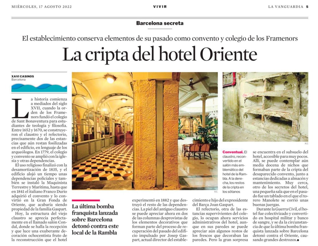 La edición impresa de La Vanguardia publicó ayer, en mi sección Barcelona Secreta, los vestigios que quedan en el Hotel Oriente de la Rambla cuando era un convento, entre ellos parte de la cripta.