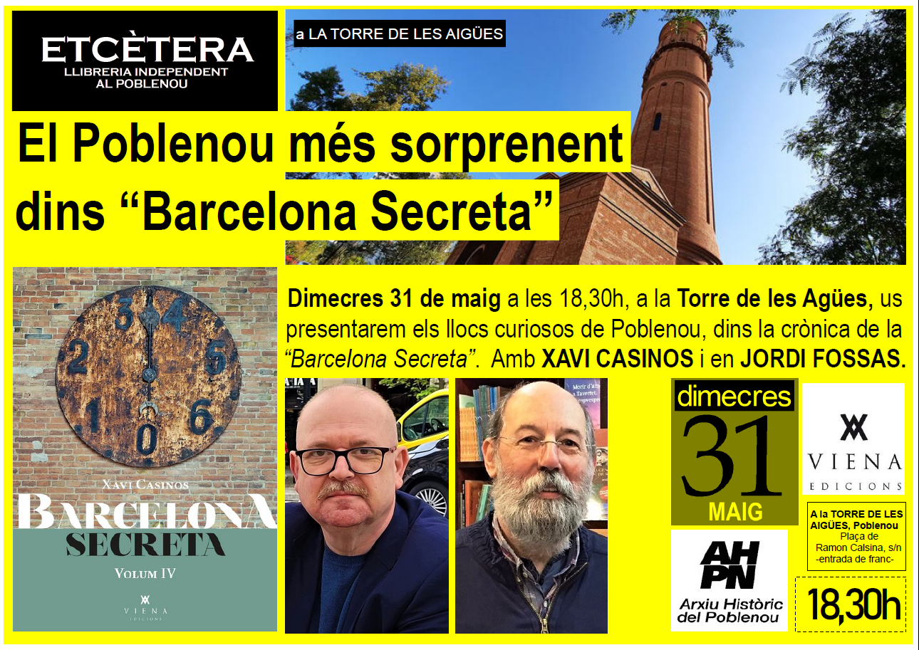 El proper dimecres 31 de març, la Torre de les Aigües del Poblenou acollirà una nova presentació del meu darrer llibre, ‘Barcelona secreta IV’. Serà a les 18.30 i un escenari singular que és un dels protagonistes del llibre i la seva portada. La presentació anirà a càrrec de l’amic Jordi Fossas, de l’arxiu històric del Poblenou. Val la pena per poder visitar la torre. Us esperem.