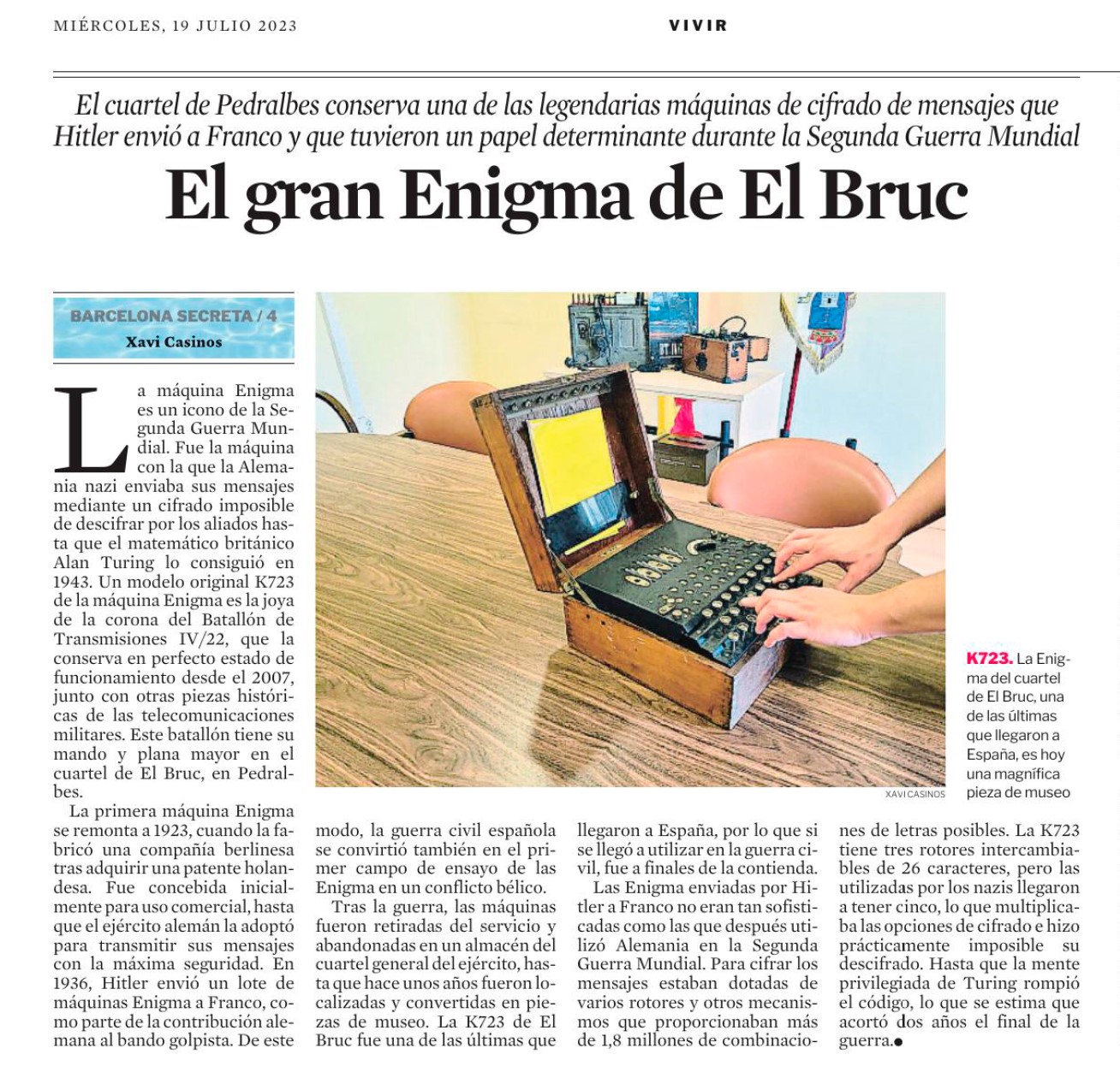 La máquina Enigma de Pedralbes La edición impresa de La Vanguardia publicó ayer una nueva entrega de mi serie Barcelona Secreta. En esta ocasión, dedicada a la legendaria máquina de encriptación Enigma que se conserva en el cuartel de El Bruch. Compártelo: Compartir en X (Se abre en una ventana nueva) X Comparte en Facebook (Se abre en una ventana nueva) Facebook Compartir en LinkedIn (Se abre en una ventana nueva) LinkedIn Me gusta Cargando... Relacionado