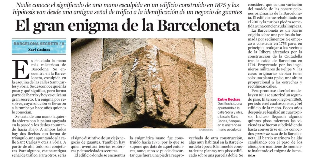 El misterio de la mano de la Barceloneta El misterio que rodea a la presencia de una mano esculpida en la esquina de las calles Sant Carles y Sòria, en la Barceloneta, protagonizó ayer la entrega de mi serie Barcelona Secreta en la edición impresa de La Vanguardia. Compártelo: Compartir en X (Se abre en una ventana nueva) X Comparte en Facebook (Se abre en una ventana nueva) Facebook Compartir en LinkedIn (Se abre en una ventana nueva) LinkedIn Me gusta Cargando... Relacionado